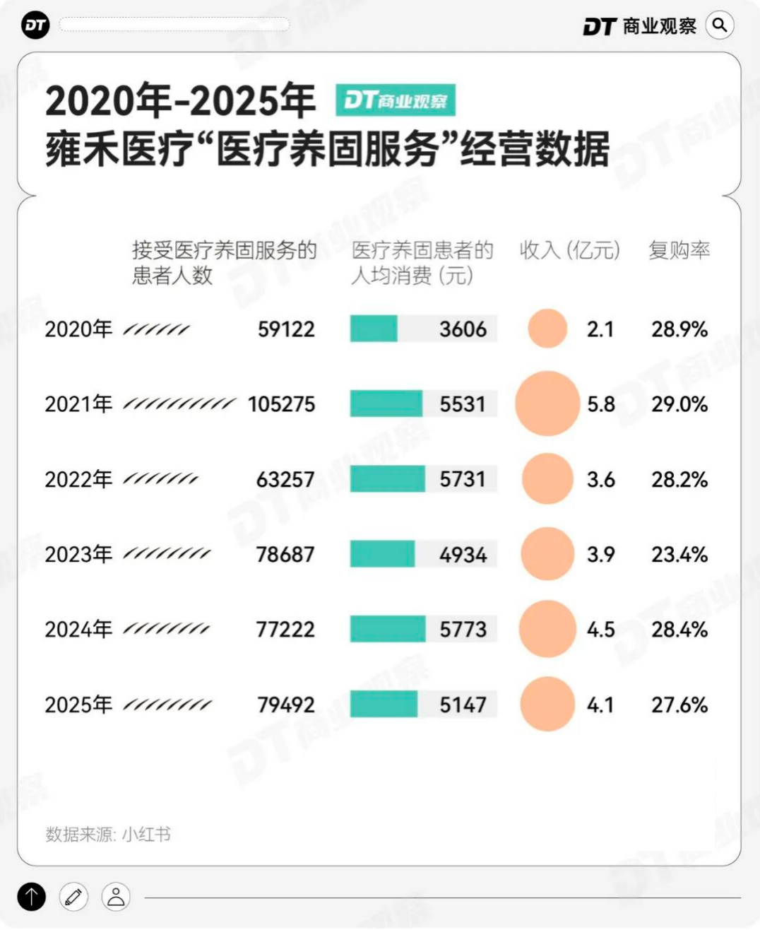 2025年,雍禾医疗的医疗养固业务消费人数为7.9万,虽然超过了植发消费人数的7.1万,但同比2024年只增加了约2000人,远低于同期植发新增的1万人。