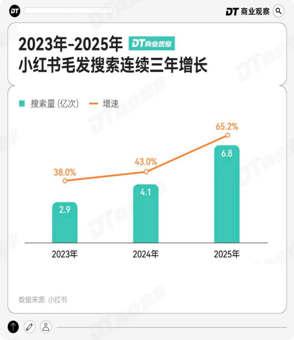 2025年,小红书毛发相关内容搜索增速达65%,已连续三年保持高增长。其中,“植发”成为一个高热度话题,植发真心话相关笔记量增长852%。