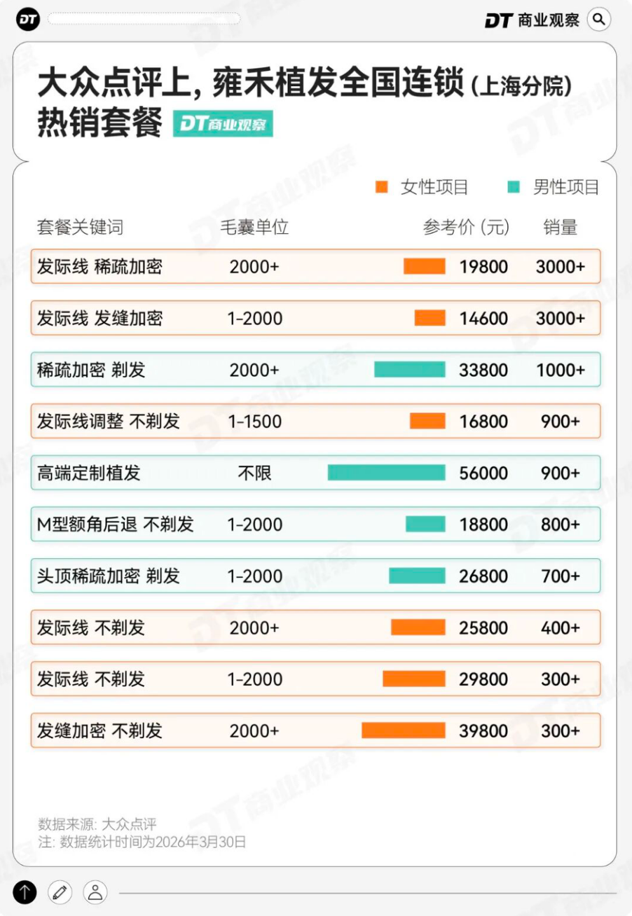 以2026年3月大众点评雍禾植发上海分院的数据为参考,目前店内销量TOP2套餐,均为针对女性的发际线植发项目,而且套餐价格都在2万元以内,低于同等毛囊单位下的男性植发套餐价格。(具体成交价格或有浮动,该价格可作市场参考)