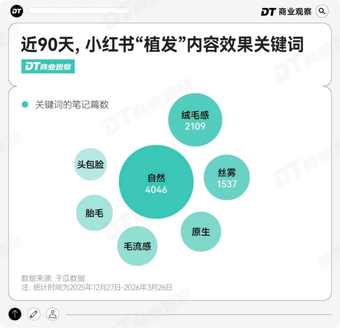 近3个月小红书植发相关内容中,“自然”“绒毛感”“丝雾”“原生”等词高频出现,而“遮秃”一词并没有被提及。