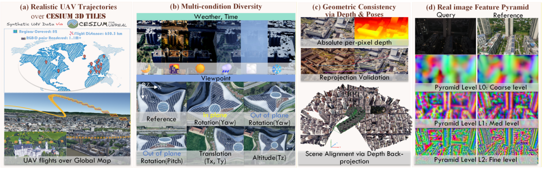 PiLoT百万级全球尺度合成数据集。图(a)展示了在Cesium 3D Tiles全球地图上轨迹覆盖区域,以及生成的真实无人机飞行轨迹。图(b)涵盖了多样化的环境模拟,包括多种天气、光照条件以及大幅度旋转和平移的视角变化。图(c)强调了我们数据集的几何一致性监督,通过绝对像素级深度进行严苛的重投影验证,确保特征学习稳定的3D几何结构。图(d)呈现了我们算法在真实场景上零样本泛化表现,Query为实拍夜晚查询图,Reference为同一视角画面,下方为输出特征金字塔对比效果。