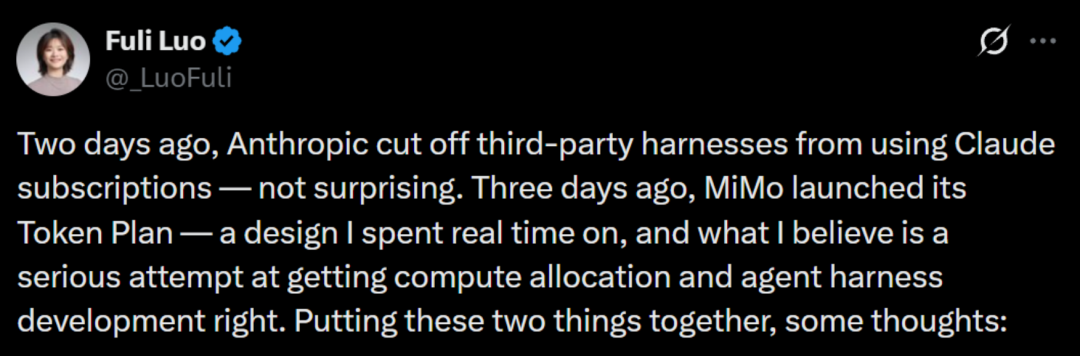 几天之前,Anthropic突然宣布切断第三方工具对Claude订阅的访问权限,这也是罗福莉发文讨论Token定价逻辑的契机。