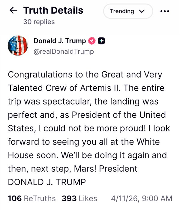 此次航天盛事的成功也引发了政界的强烈反应。特朗普第一时间在社交媒体上发文,向才华横溢的全体机组人员表示热烈祝贺。他称赞这次着陆过程完美无缺,并对美国航天事业的成就感到自豪。