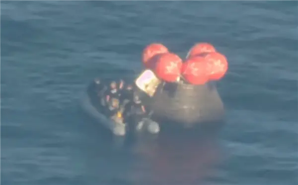 溅落足足50分钟后,搜救小队乘坐皮筏艇抵达返回舱旁,并打开了舱门。