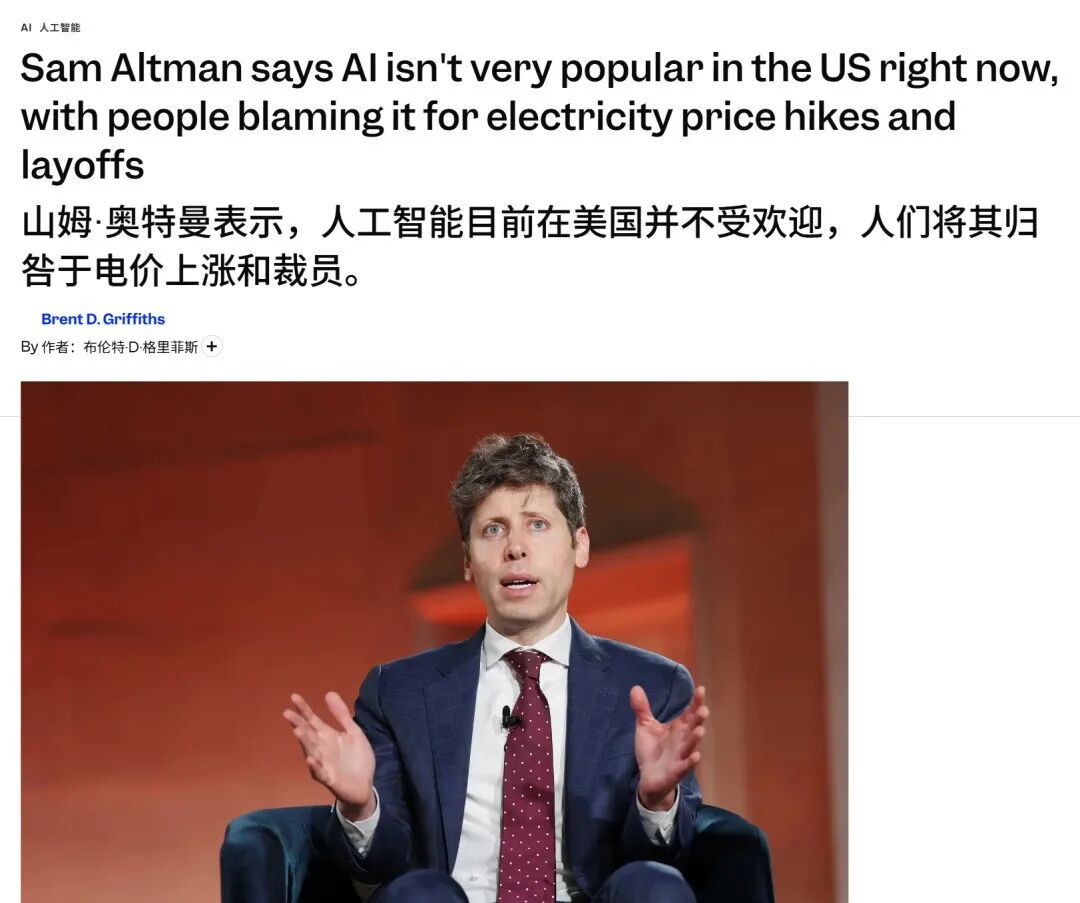 奥特曼也明白,AI在美国大众的心目中并不受欢迎,很多人认为电价上涨、大量裁员的罪魁祸首就是AI。
