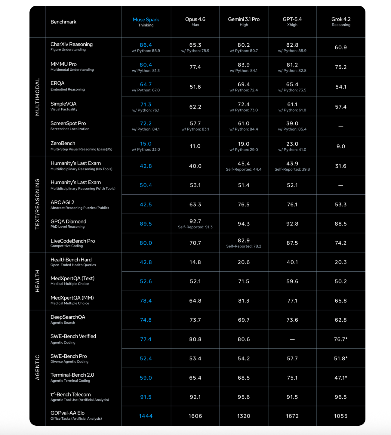 On ARC AGI 2, Muse Spark scores 42.5 against Gemini 3.1 Pro High’s 76.5 and GPT-5.4 Xhigh’s 76.1 — the largest performance gap in the entire benchmark table.