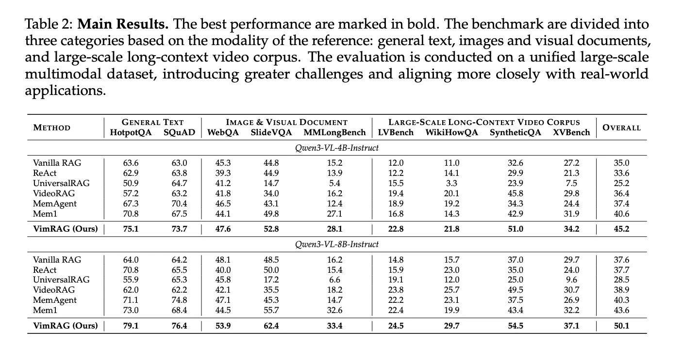 VimRAG was evaluated across nine benchmarks — HotpotQA, SQuAD, WebQA, SlideVQA, MMLongBench, LVBench, WikiHowQA, SyntheticQA, and XVBench, a new cross-video benchmark the research team constructed from HowTo100M to address the lack of evaluation standards for cross-video understanding. All nine datasets were merged into a single unified corpus of approximately 200k interleaved multimodal items, making the evaluation harder and more representative of real-world conditions. GVE-7B served as the embedding model supporting text-to-text, image, and video retrieval.