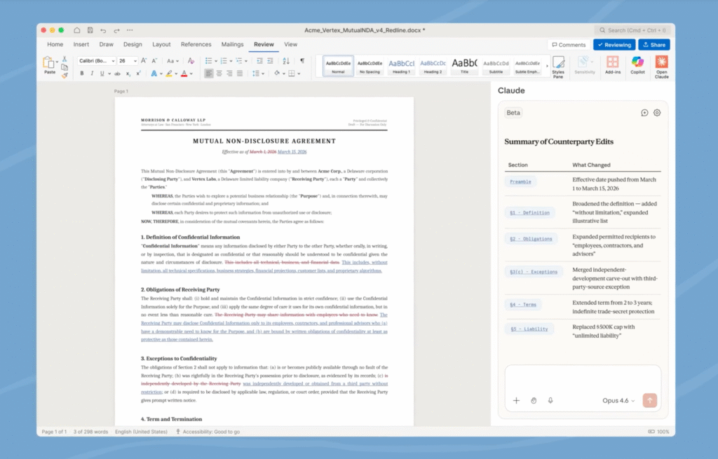 ‘Whether you’re triaging counterparty redlines, drafting from a template, or running a final consistency check, Claude maintains full transparency — every edit can land as a tracked change you review before accepting.’