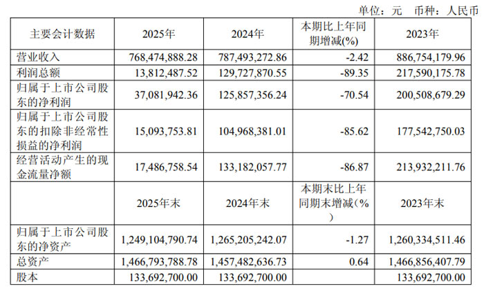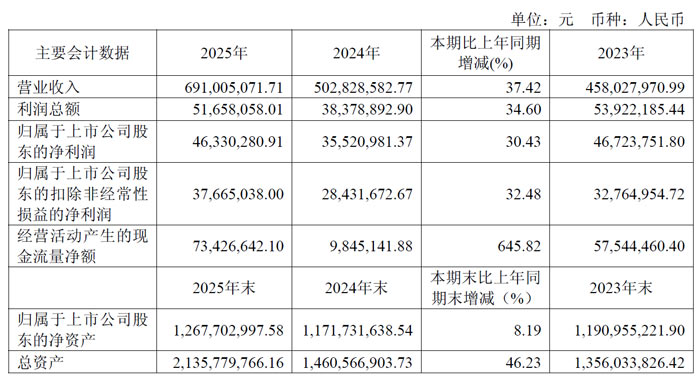 2025 年,公司经营呈现 “研发加码、结构优化、赛道延伸” 的发展特征。财务数据方面,公司全年营业总收入7.68 亿元,同比下降2.42%;归属于上市公司股东的扣除非经常性损益的净利润1509.38 万元,同比下降85.62%;经营活动产生的现金流量净额1748.68 万元,同比下降86.87%。截至报告期末,公司总资产14.67 亿元,归属于上市公司股东的净资产12.49 亿元,整体资产结构保持稳健。
