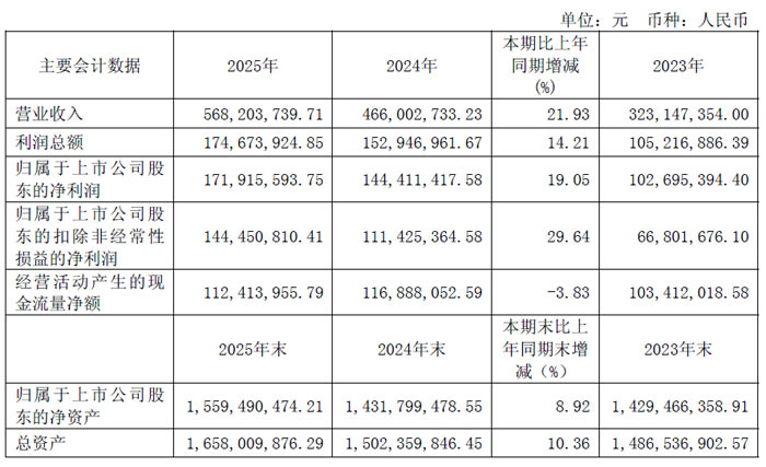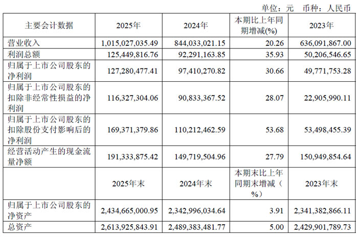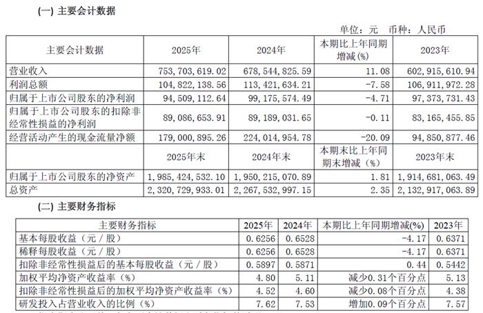 2025 年,公司实现营业收入 12.38 亿元,同比增长 8.98%;归属于上市公司股东的净利润 1.89 亿元,同比下降 11.71%;扣除非经常性损益后的净利润 1.86 亿元,同比下降 12.93%。