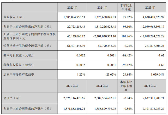 2025 年,合力泰实现营业收入 16.85 亿元,较上年同期增长 27.02%;归属于上市公司股东的净利润2272.33 万元,同比下降 98.50%;归属于上市公司股东的扣除非经常性损益的净利润4513.91 万元,同比增长 101.96%,实现经营性盈利。