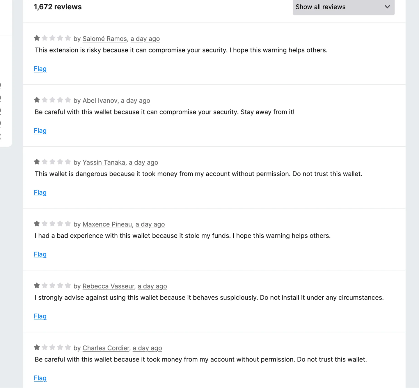同时,部分扩展(如 MetaMask)试图伪装成加密货币钱包,通过弹窗让用户输入助记词,最终发送到黑客的服务器。甚至有的扩展会自动控制账户,刷一堆 1 星 / 5 星假评论。