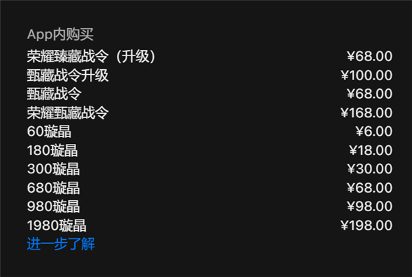 在商业模式上,《王者荣耀世界》移动端提供内购内容,以iOS版为例,玩家可购买璇晶、臻藏战令、荣耀臻藏战令等道具与权益。