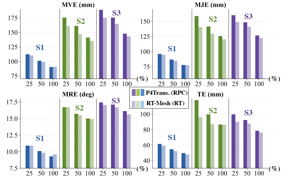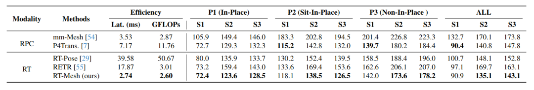 从实验结果看,在 radar-only 设置下,RT 和 RPC 在随机划分上的表现较为接近;但在 cross-subject 和 cross-action 这类更具挑战性的设置中,RT 往往更稳定。以 ALL 协议为例,RT-Mesh 的 MVE 在 S1/S2/S3 上分别达到 90.9 / 135.1 / 143.1 mm,推理延迟仅为 2.74 ms,计算量约 2.6 GFLOPs。