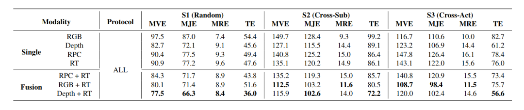 M4Human 的价值不仅在于发布了一个新数据集,还在于建立了一套相对系统的评测框架。除了动作协议划分,论文进一步定义了 Random split、cross-subject 和 cross-action 三种划分方式,分别用于评估常规设置下的表现,以及更具挑战性的泛化能力。