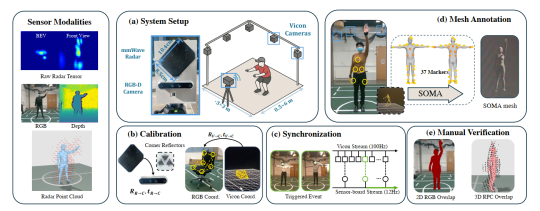 一个 benchmark 是否有说服力,很大程度上取决于数据采集与标注流程是否扎实可靠。M4Human 在这方面搭建了一套完整的多模态采集平台:作者将 Intel RealSense RGB-D 相机、Vayyar 成像毫米波雷达和 Vicon MoCap 系统集成到一起,相机与雷达固定安装,Vicon 系统则提供高精度三维运动捕捉。