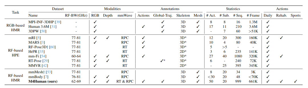 M4Human 与已有 RF/mmWave 人体感知数据集对比。M4Human 规模更大、动作更多、标注更细、同时开放 RT 与 RPC,并支持 mesh reconstruction 与全局轨迹。