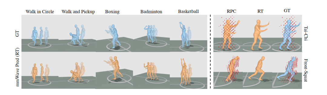 这项工作的关键不是 “数据更多”,而是“数据更适合高保真人体建模”。一方面,M4Human 的动作设计更丰富 —— 不仅包含原地动作,还涵盖坐姿以及非原地的动态动作,整体分布更接近真实场景;另一方面,它提供了更完整的雷达数据表征,既开放后处理得到的点云,也保留原始 RT,让研究者可以探索从 radar tensor 到人体 mesh 的端到端建模。