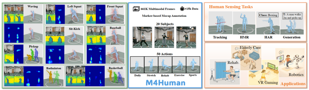 M4Human - 面向多任务的人体感知 benchmark:涵盖 50 类动作、20 位参与者、661K 帧数据,并支持 tracking、mesh reconstruction、activity recognition、generation 等任务。