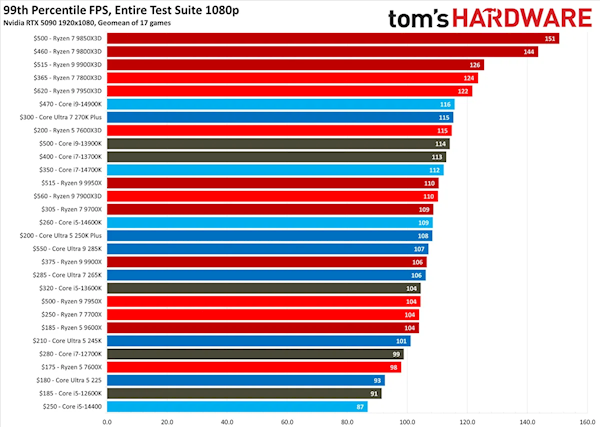 游戏性能这块,AMD直接杀穿了榜单。锐龙7 9850X3D拿下1080p游戏性能榜首,成了目前市面上最快的游戏CPU。这次测试全程搭配NVIDIA RTX 5090FE显卡,测了17款主流3A和电竞游戏,全是高、超高画质设定,最终它的游戏帧率几何均值冲到了217FPS。同架构的锐龙79800 X3D跟得很紧,能跑出它97%的性能表现。