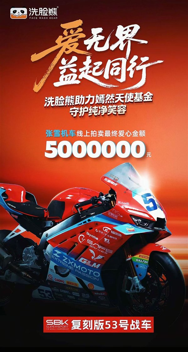 昨晚,洗脸熊企业认证账号和张雪机车、李亚鹏共创视频称:“张雪机车&洗脸熊携手为北京嫣然天使儿童医院捐赠500万,院方已全额收到该笔捐款。”