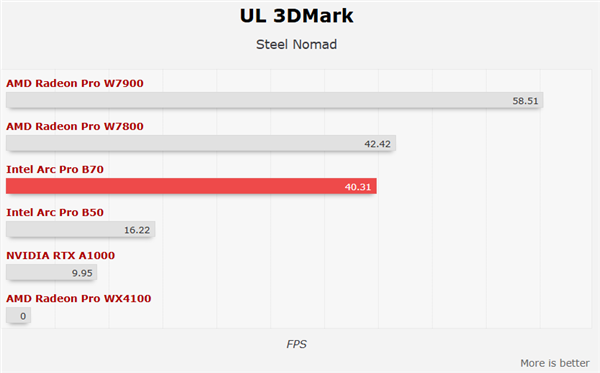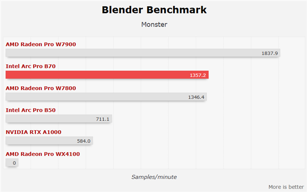 单卡测试中,工作站类应用表现还是不错的,基本和AMD Radeon Pro W7800一个档次,有时还能大幅领先,甚至战平更高级的Radeon Pro W7900,比如Bldender Classroom。