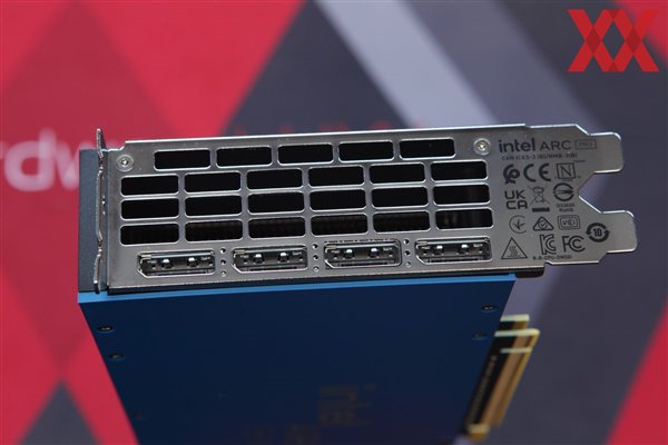 锐炫Pro B70采用台积电5nm工艺,核心面积368平方毫米,集成277亿个晶体管,配备32个Xe2核心,最高频率2.8GHz,256-bit 32GB GDDR6显存,带宽608GB/s,输出接口四个DP。