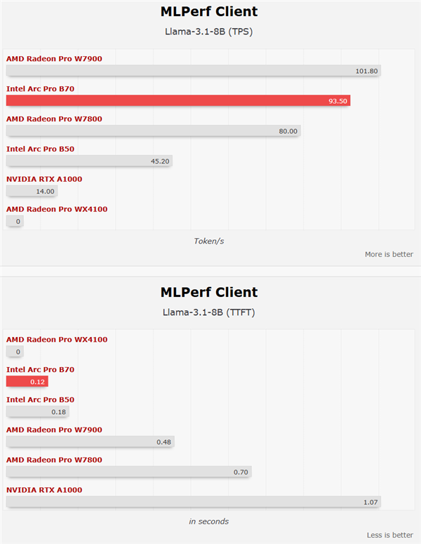AI测试中,AIDA64双精度算力、GeekBench AI量化、MLPerf Llama生成速度和首字时间、Procyon图文生成等,都表现亮眼,尤其是首字时间远超AMD、NVIDIA。