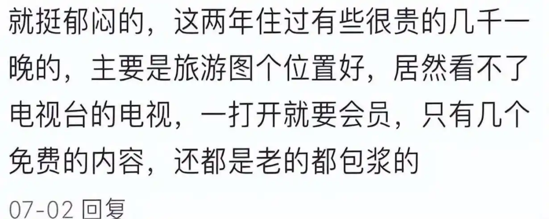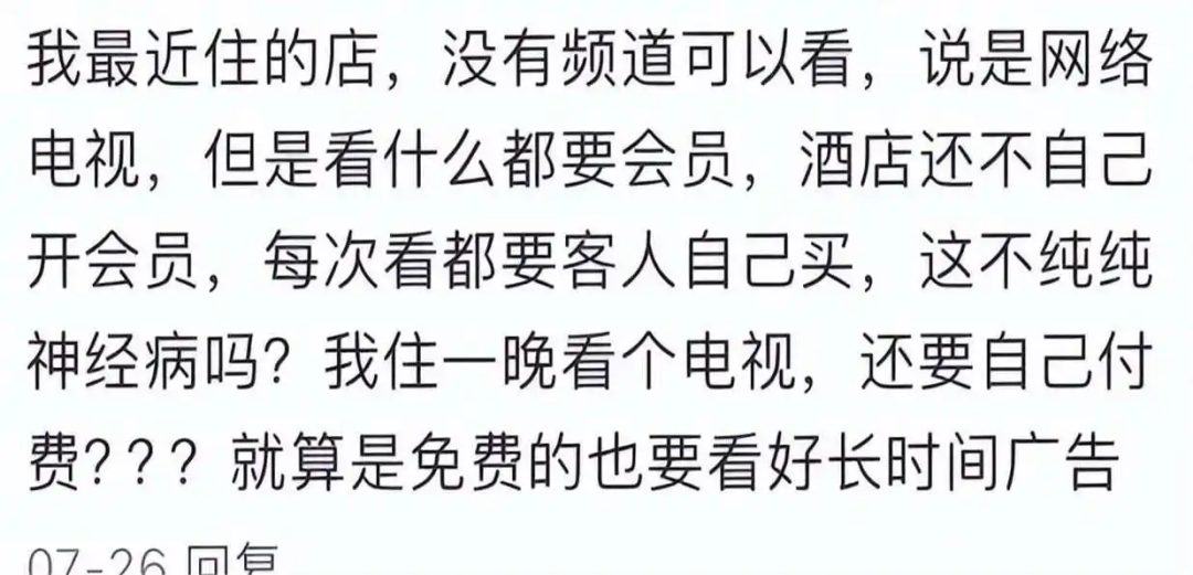 在社交平台上搜索酒店电视,能看到漫山遍野的抱怨,其中出现频率最高的一句话就是看什么都收钱。有人为了体验好一点,特地加钱订了影音房,进去发现里面的资源全是十几年前的老片子,而且还得另外买会员才能看。