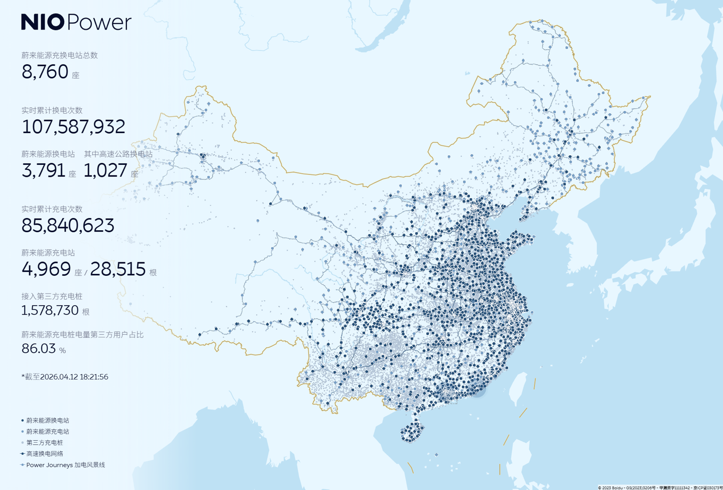 目前,蔚来能源充换电站总数已达到 8760 座:蔚来能源换电站 3791 座,其中高速公路换电站 1027 座;蔚来能源充电站 4969 座,接入第三方充电桩 1578730 根。