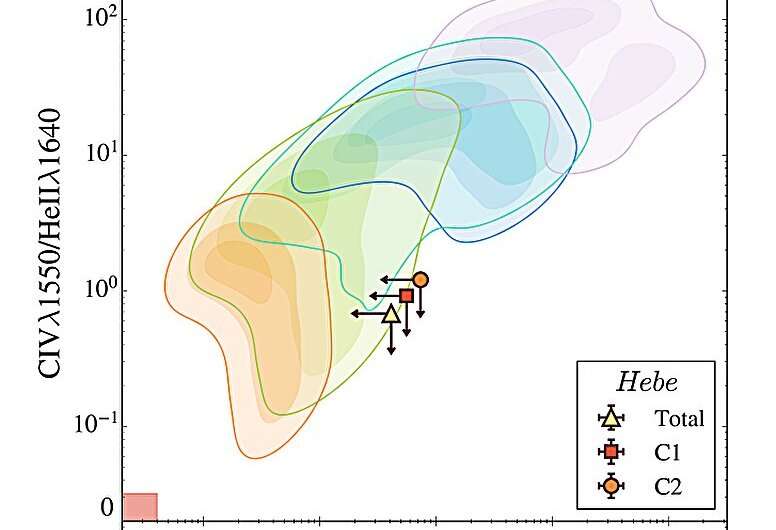 随后,鲁斯塔团队通过理论建模,利用观测到的赫柏天体氦氢比例,推算出这些初代恒星的大致质量范围。分析结果显示,这些恒星的质量分布偏向大质量恒星,多数质量约为太阳的 10 至 100 倍,这与相关预测一致,即早期宇宙尚未被重元素富集时,诞生的初代恒星温度高、质量大。