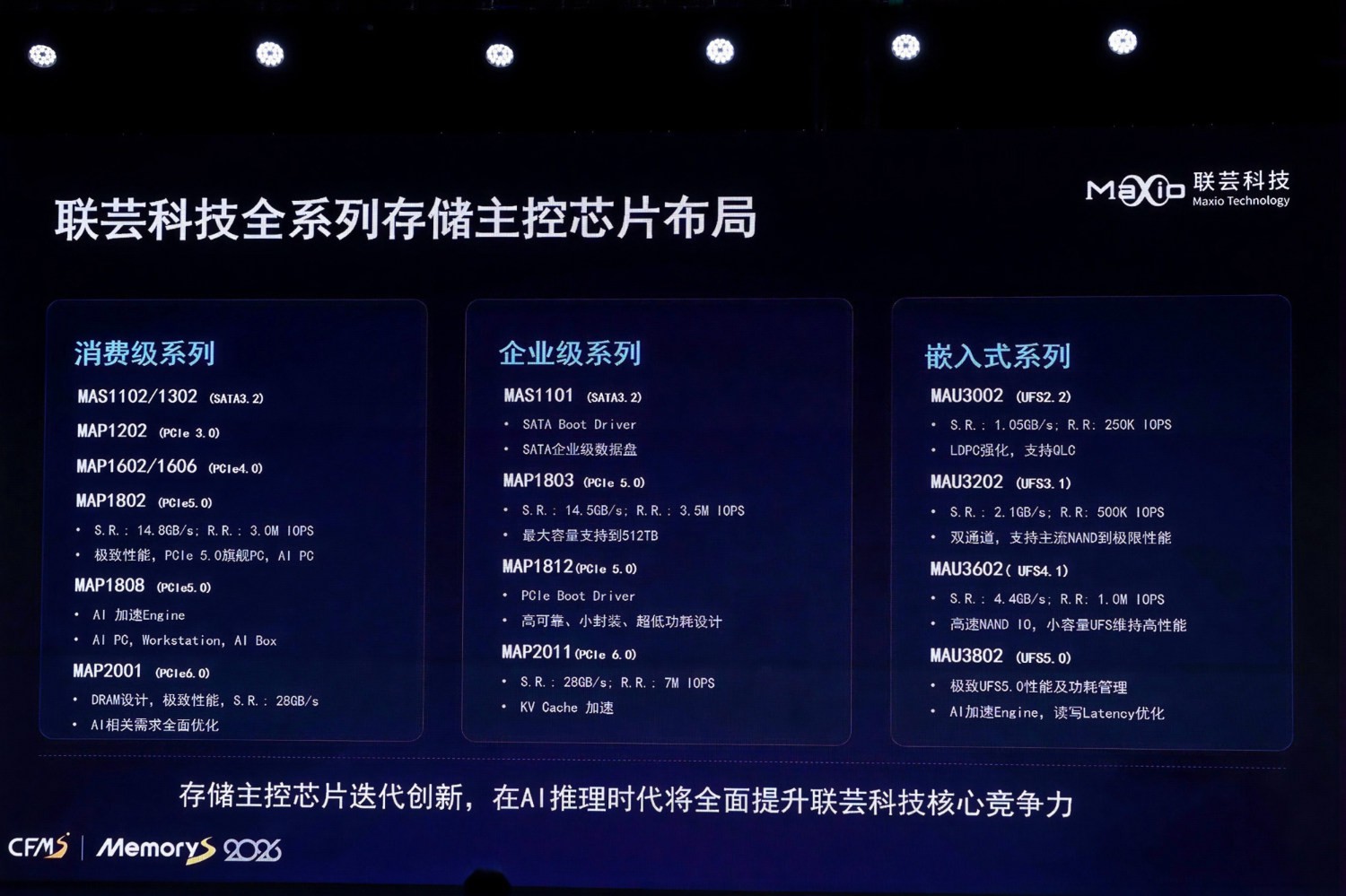 IT之家 4 月 13 日消息,联芸 Maxio 在上月末举行的 CFMS | MemoryS 2026 上公布了其存储开发路线图,其中提到了支持 PCIe Gen6 的消费级 / 客户端 SSD 主控 MAP2001。IT之家注意到,这很可能是首个出现在大众视野中的同定位产品型号。