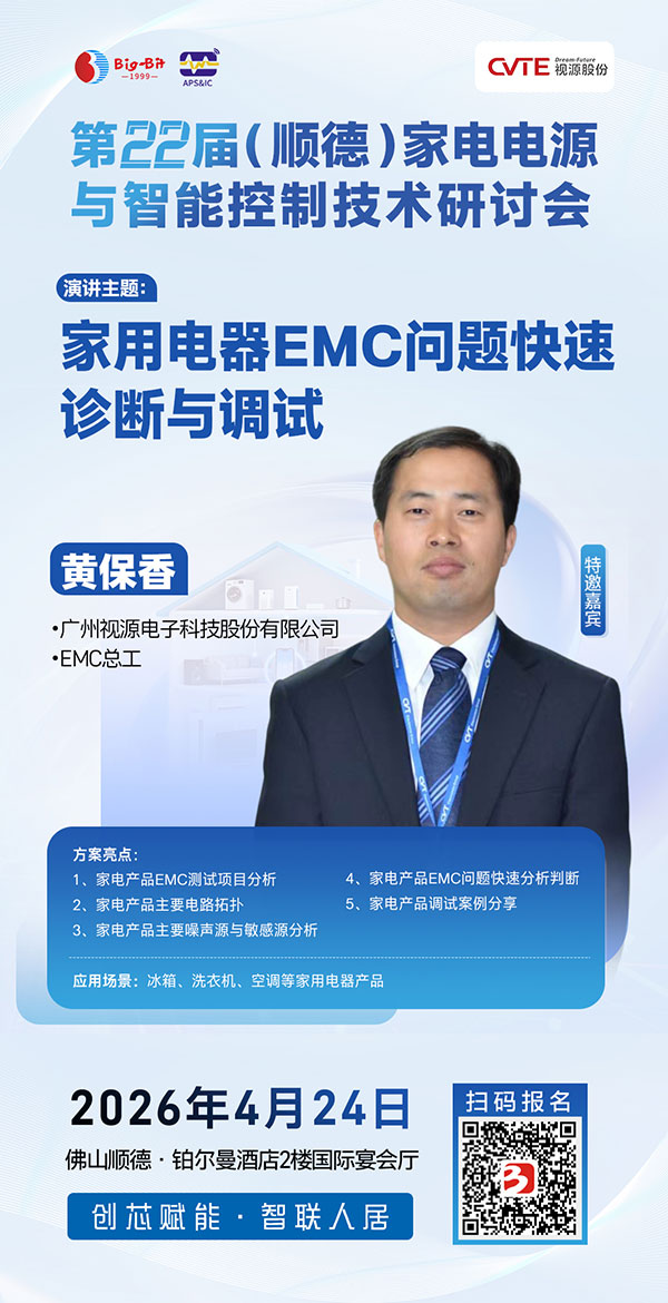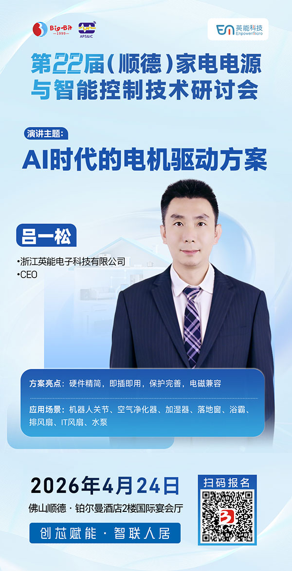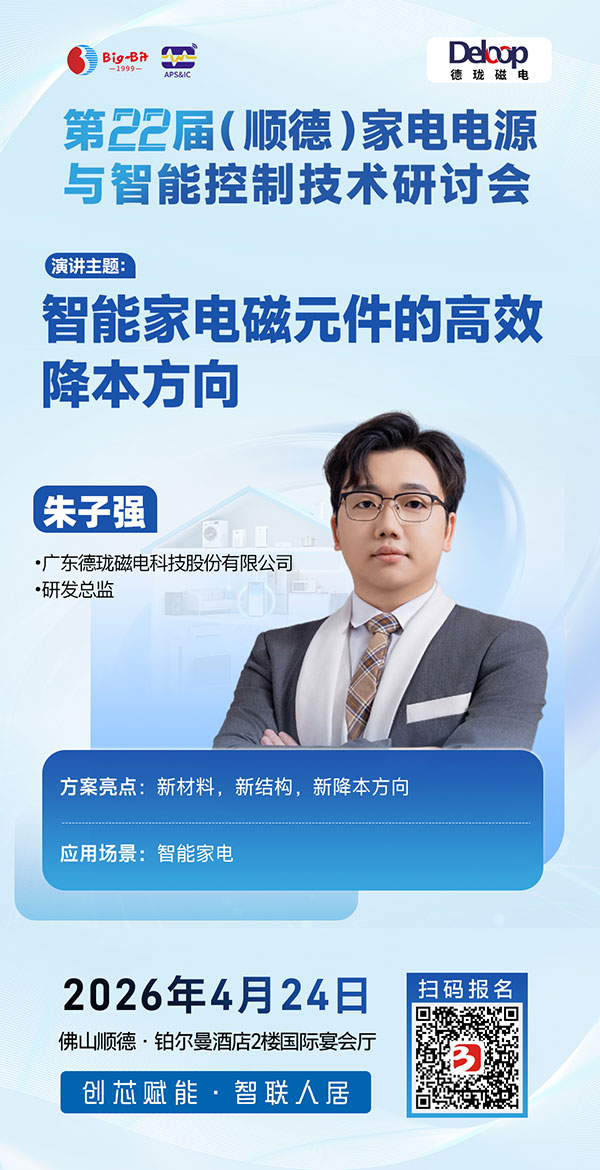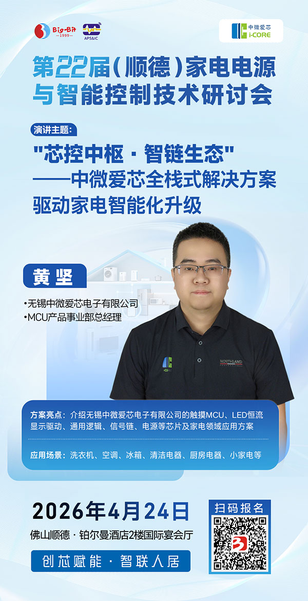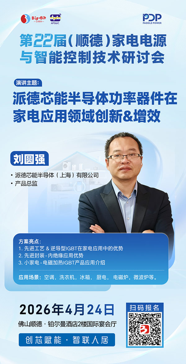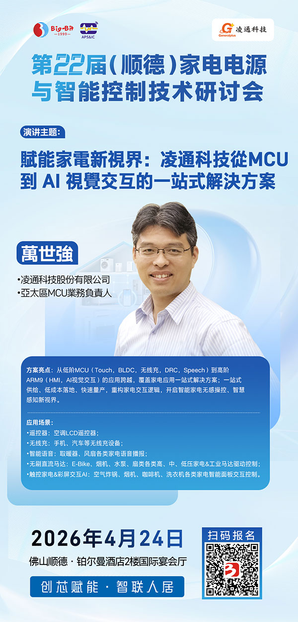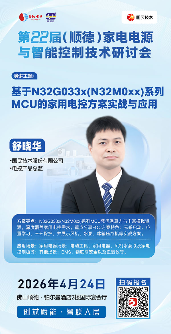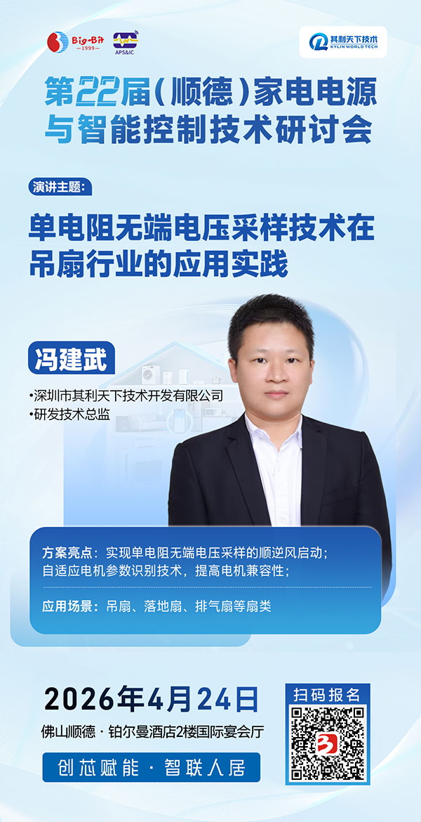 2026年4月24日,相约广东顺德! 欢迎家电电源、智能控制及变频驱动领域的研发工程师、产品经理及企业管理代表踊跃报名,与行业同仁共聚一堂,携手创“芯”赋能,智联人居未来!