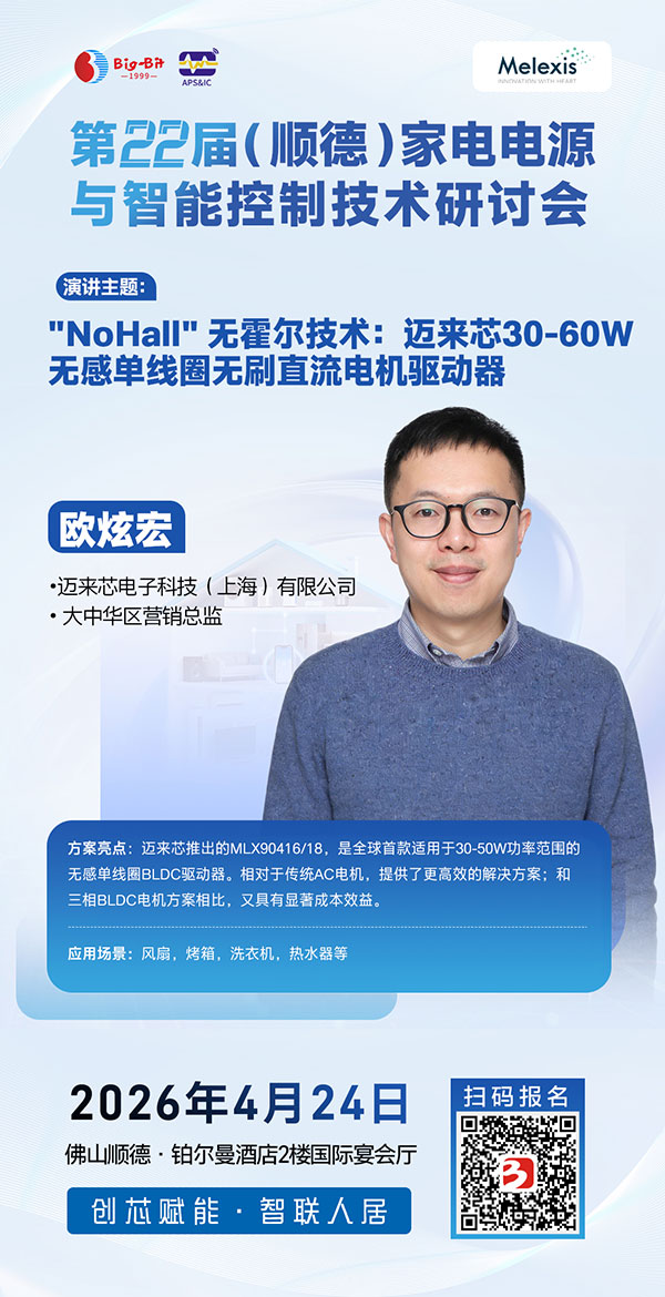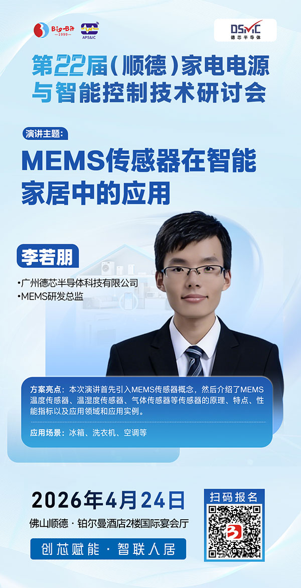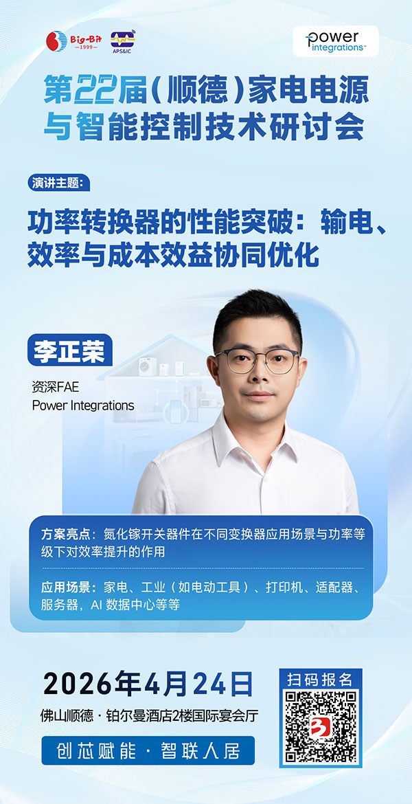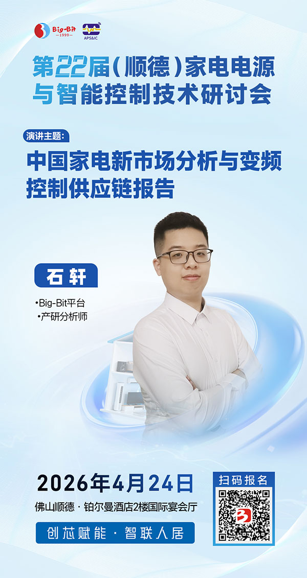 随着家电智能化浪潮席卷全球,家电半导体芯片的高集成度、高能效设计与AI交互能力正重塑产业竞争格局。为应对家电市场对智能控制与变频驱动家电技术的迫切需求,由Big-Bit商务网主办、《半导体器件应用》杂志承办的第22届(顺德)家电电源与智能控制技术研讨会将于2026年4月24日在广东顺德隆重召开。
