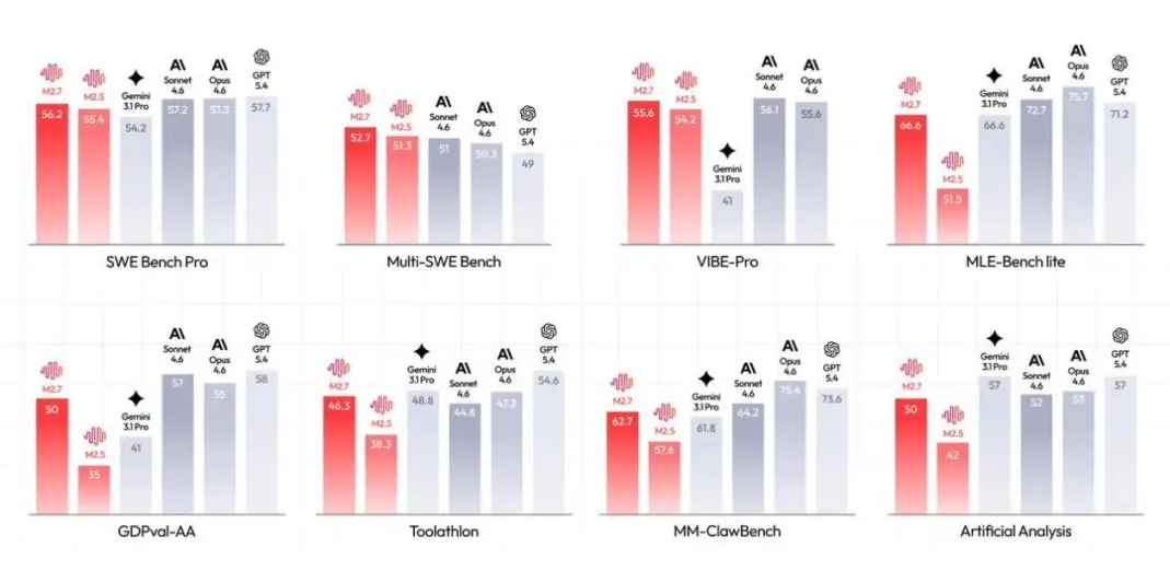 开发等方向。在涵盖多种编程语言的基准测试 SWE-Pro 中 M2.7 以 56.22% 的正确率追平 GPT-5.3-Codex;而在更贴近真实工程场景的 SWE Multilingual(76.5)和 Multi SWE Bench(52.7)中展现出更显著优势。