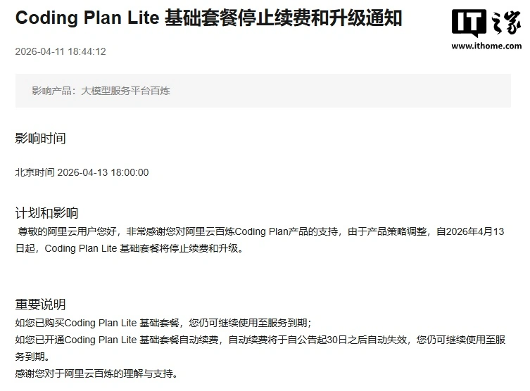 4 月 12 日消息,阿里云昨日宣布,由于产品策略调整,其大模型服务平台百炼旗下的 Coding Plan Lite 基础套餐将于 4 月 13 日 18 时起正式停止续费和升级。
