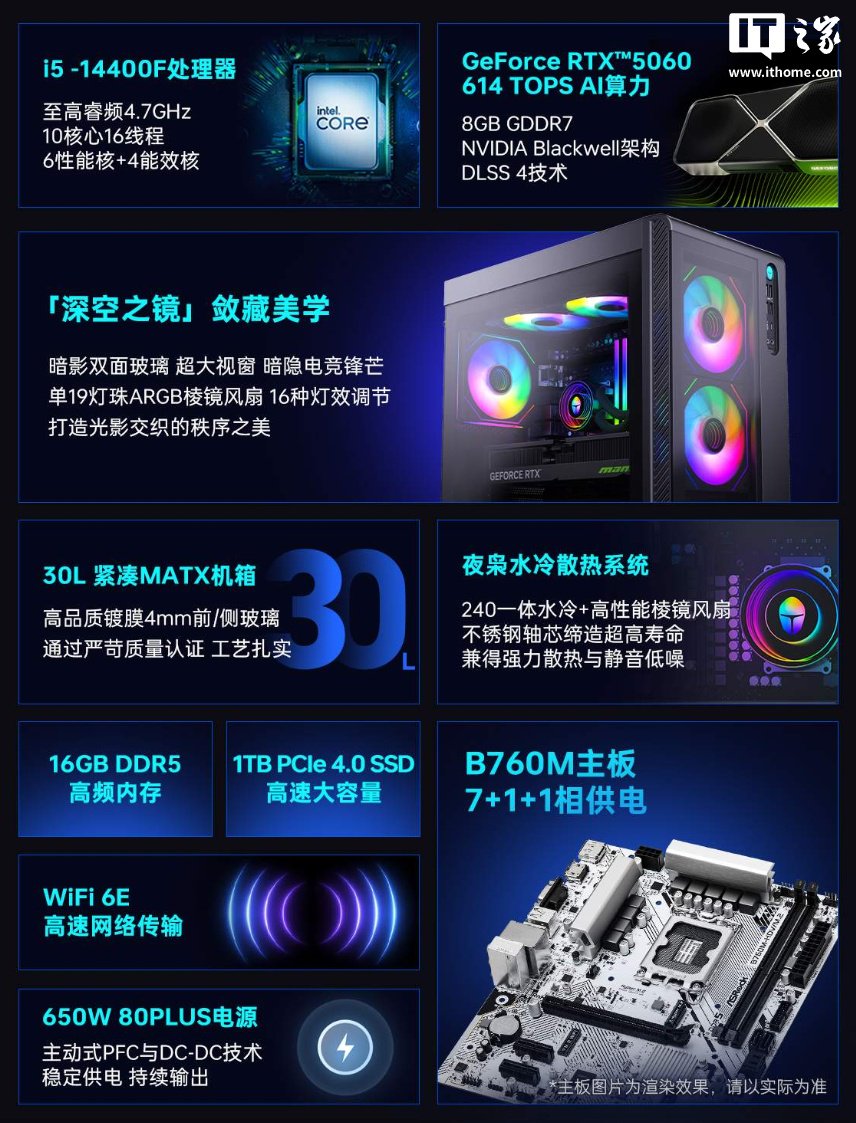 IT之家注意到,这款电脑的机箱容积为 30L,采用“深空之镜”敛藏美学,配备双面暗影玻璃,自带的风扇镶嵌 19 颗 ARGB 灯珠,可呈现 16 种炫彩灯效,正 / 侧双面均有暗影透视玻璃,顶部还带有免工具可拆卸防尘网,方便随时清灰。