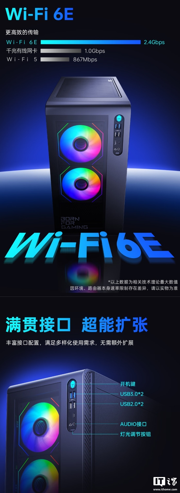 这款电脑还带有雷神自家 240mm 一体式水冷散热,标配 16GB DDR5 高频内存、1TB PCIe 4.0 固态硬盘,配备 650W 80 PLUS 电源,支持蓝牙 5.3 + WiFi 6E,前面板提供了 USB 3.0、USB 2.0 以及 3.5mm 音频接口。