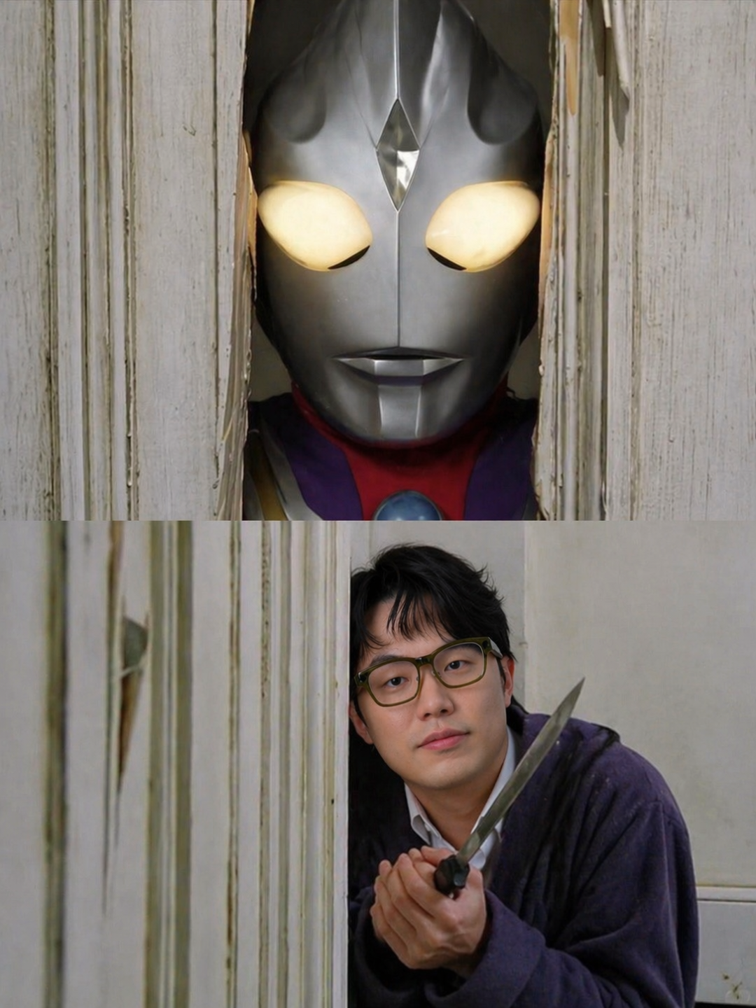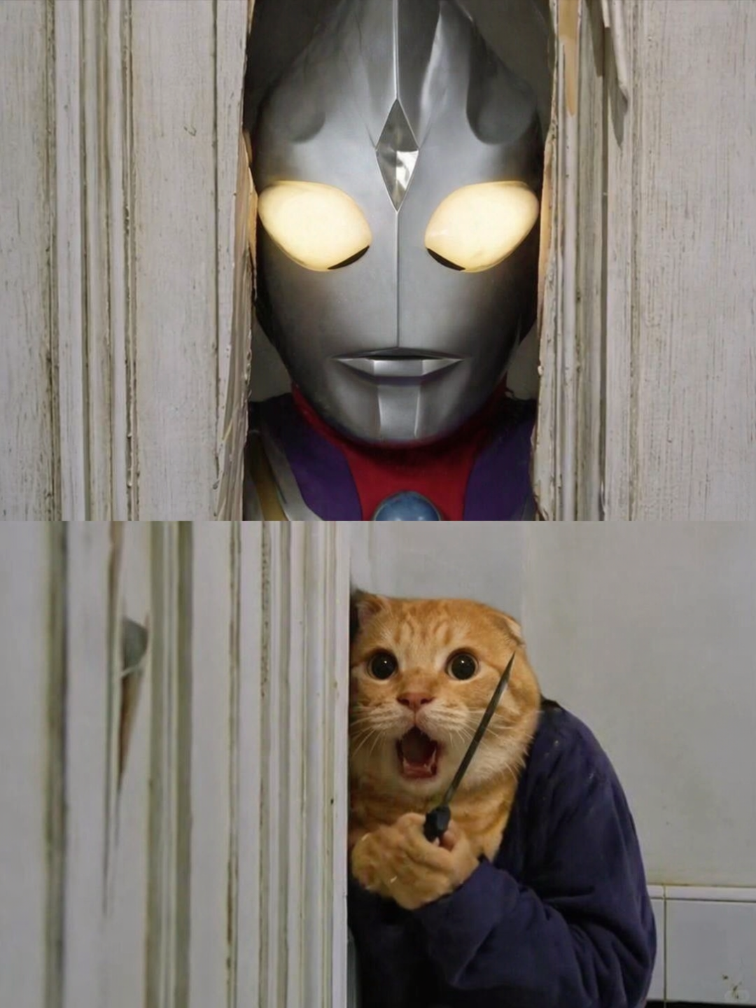 我传了一张电影《闪灵》的经典画面,就是杰克·尼科尔森把脸怼进门缝里那张,然后配上了两张参考图,迪迦奥特曼和一只黄色猫咪。