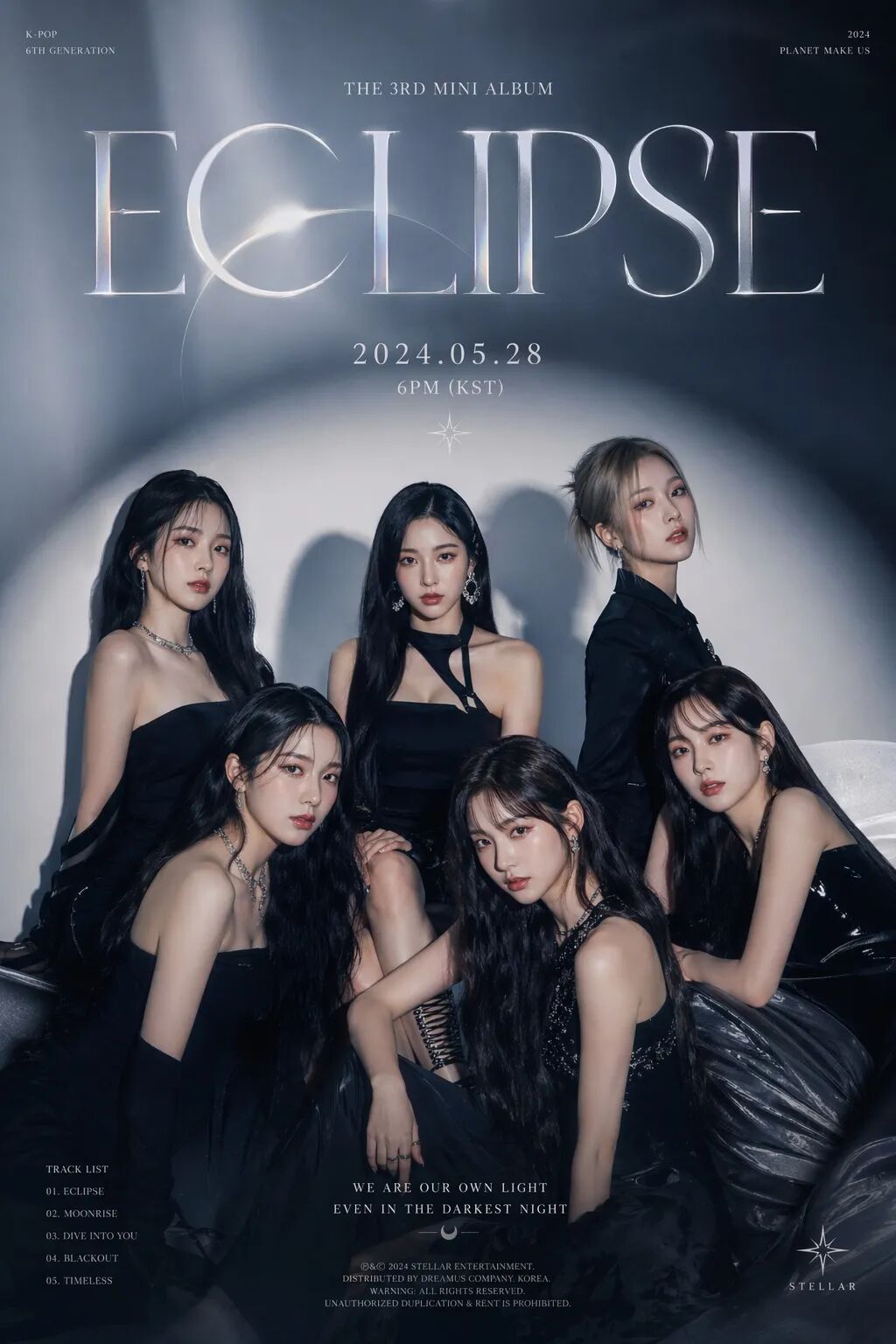 所有人都穿黑色系的造型,打光是侧逆光加柔焦,整体色调偏冷灰蓝,跟ECLIPSE(日食)的概念完全吻合。