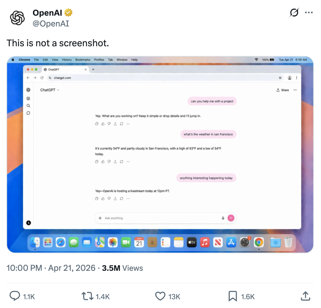 同时,OpenAI 在推特上甩了一张截图当预告,配文「This is not a screenshot」,这张截图本身就是 ChatGPT Images 2.0 画的