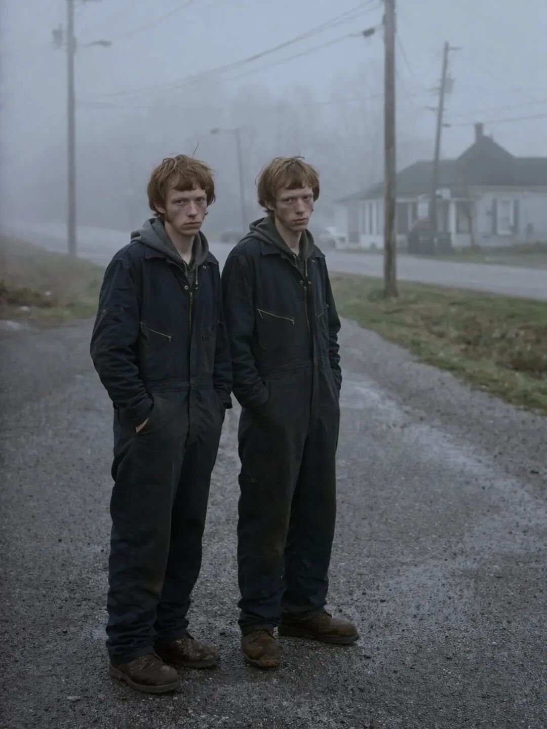 超现实双胞胎肖像中画幅模拟相机,85mm f/4,雾蒙蒙的美国乡村公路上一对双胞胎的特写