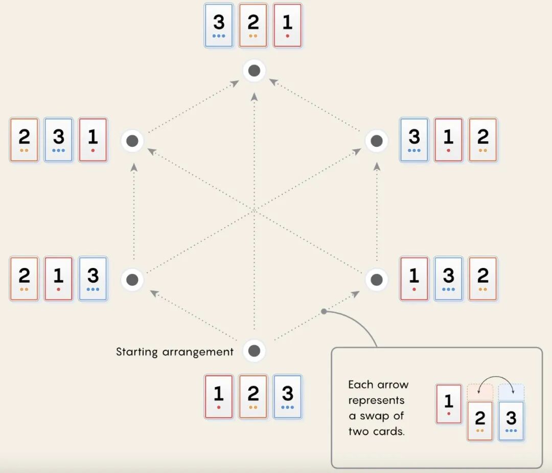 这些不同的排列方式可以排列成一个由顶点和边组成的网络,称为图。起始排列 123 放在底部。图的每条边(画成箭头)代表两张牌的交换: