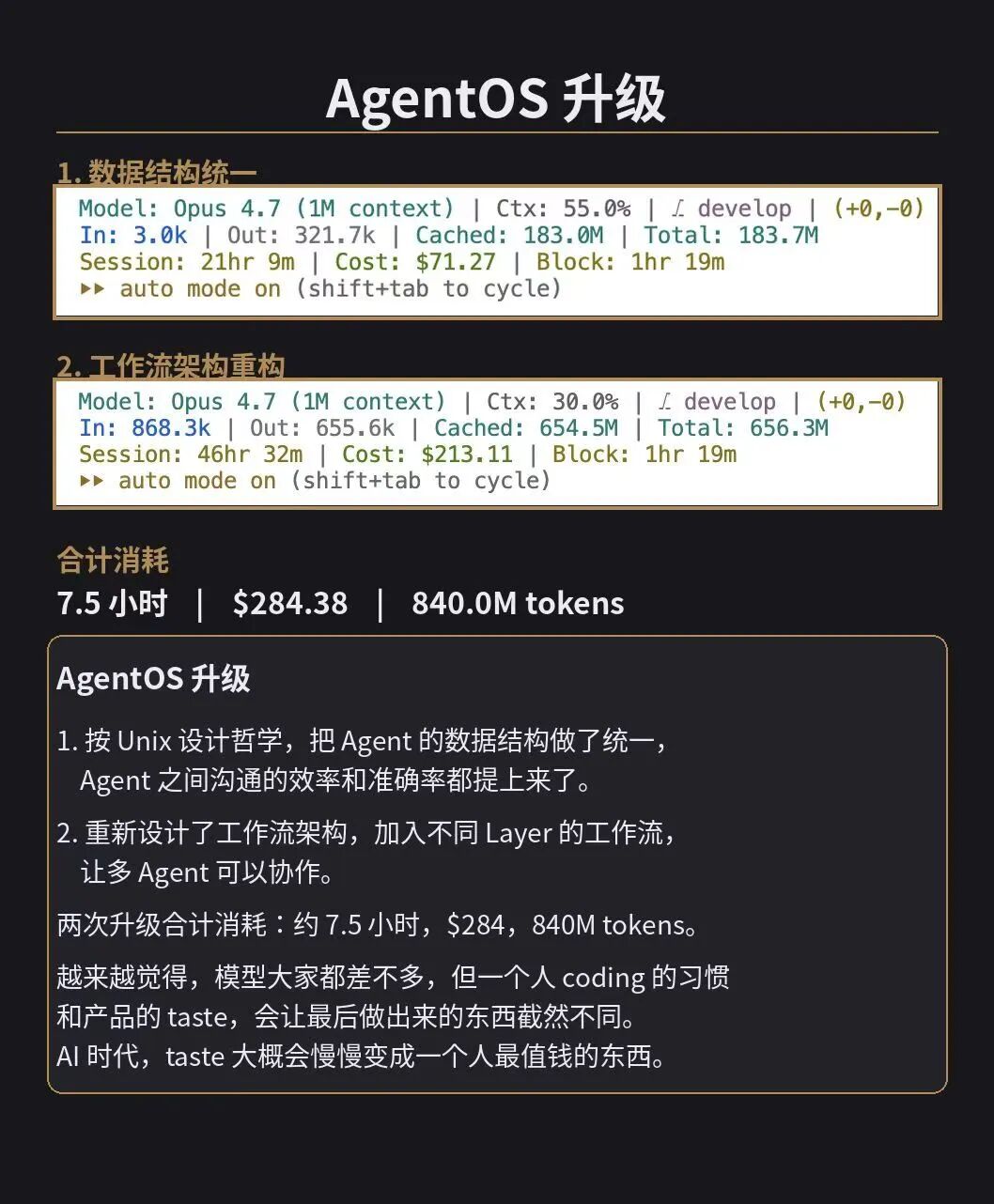 一次 AgentOS 升级的实测账单:7.5 小时、$284、8.4 亿 tokens。——独立开发者 Nathan(AI 博主“AI Nate”)
