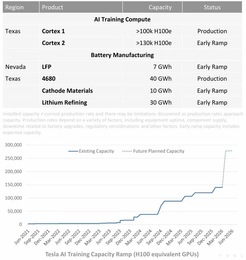 人工智能训练计算能力的扩张同样消耗了大量资本。德克萨斯州的Cortex 1集群拥有超过10万颗H100等效GPU,Cortex 2则配备超过13万颗H100等效GPU且正处于早期提升阶段。从特斯拉公布的训练能力提升曲线来看,现有及计划中的总容量已从接近零增长至超过30万颗H100等效GPU。Dojo 3定制芯片的开发工作仍在继续,目标是降低长期训练成本。