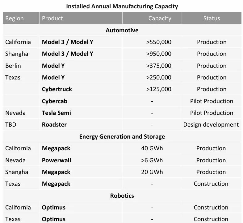 特斯拉2026年第一季度不同产品产能扩张情况