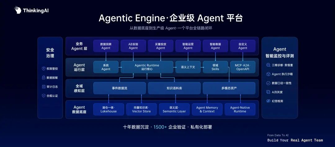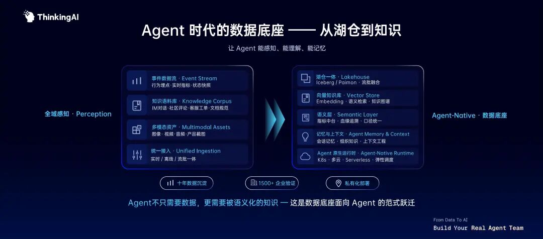ThinkingAI对数据底座的理解,已经不再停留在分析时代那种“湖仓一体+指标平台”的传统范式,而是把它重新定义为一套面向Agent运行的数据基础设施。