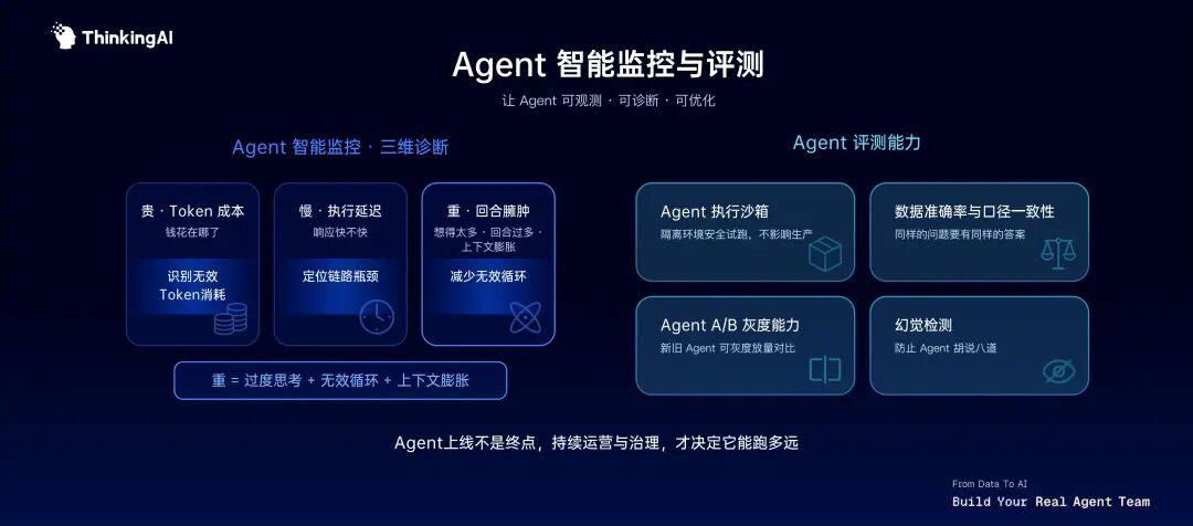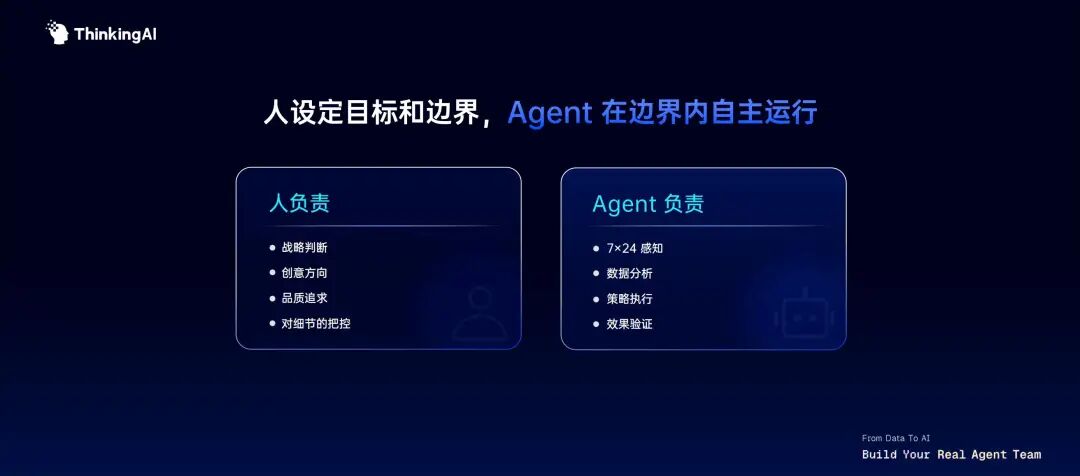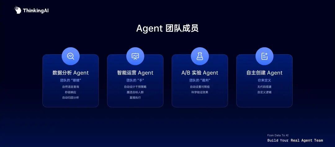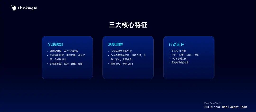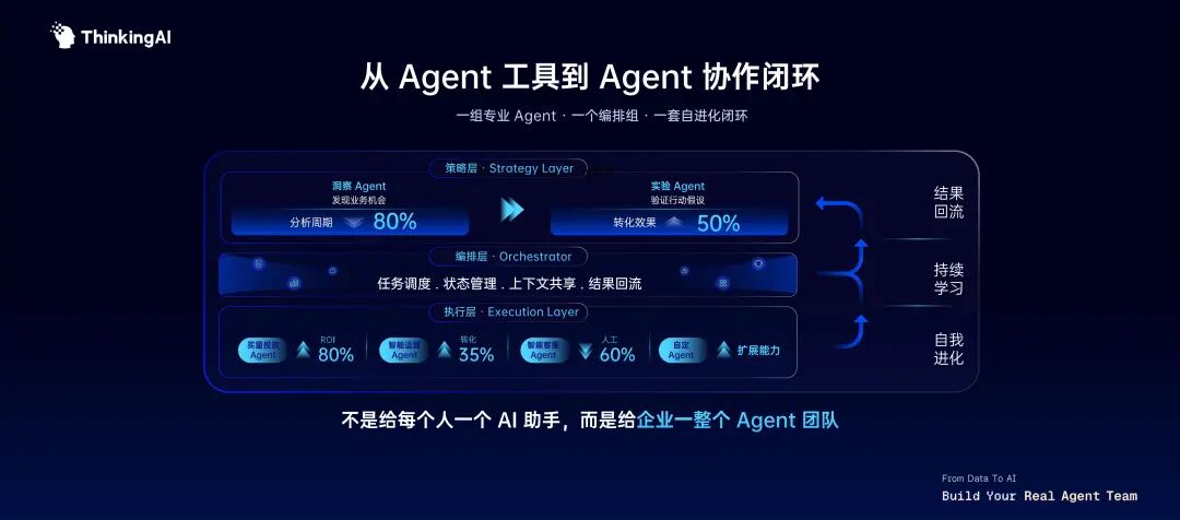 但ThinkingAI瞄准的,不只是“辅助”,而是“交付”。不同Agent围绕同一业务目标协同工作:有的负责感知数据,有的负责分析原因,有的负责生成策略,有的负责执行动作,还有的负责验证结果、持续迭代。它们不是一个个孤立的工具,而是开始像一个团队那样分工、配合、运转。
