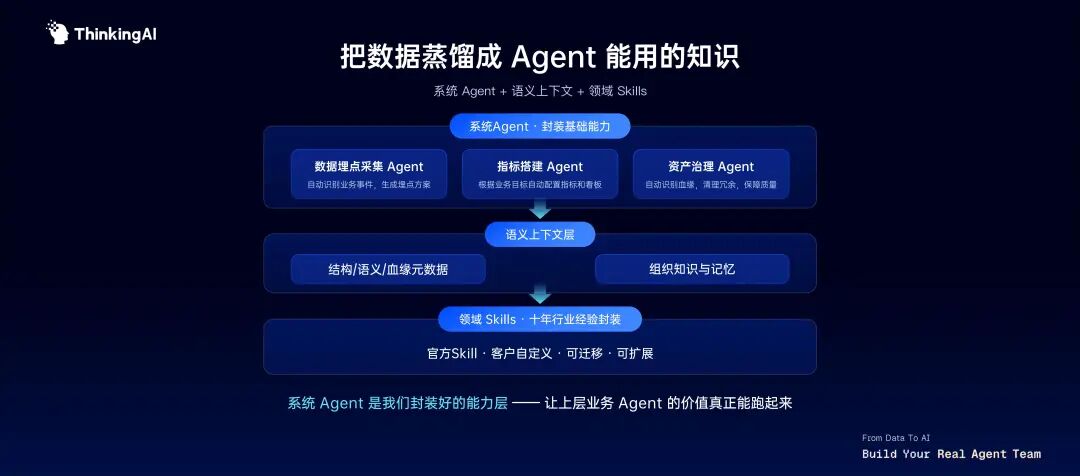 第三,系统能力的封装。ThinkingAI提出“系统Agent+语义上下文+领域Skills”的结构,等于是在通用模型和具体业务Agent之间,再加一层长期工程化沉淀下来的能力层。比如指标搭建Agent、数据埋点采集Agent、资产治理Agent,这些都不是简单的对话功能,而是把过去十年在数据世界里积累下来的方法论,封装成可复用、可迁移、可扩展的系统能力。