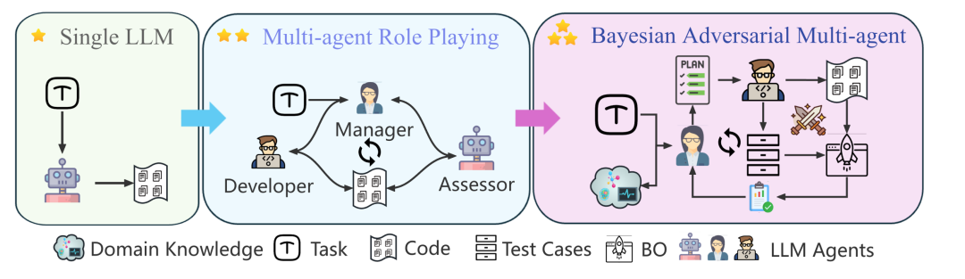 为此,复旦大学、上海科学智能研究院(下称上智院)、上海创智学院的联合研究团队提出了一种贝叶斯对抗式多智能体框架,用一种全新的思路解决上述难题。该框架不依赖单一模型的自我修正能力,而是通过多角色分工与对抗博弈,让系统在持续的「攻防演练」中自发涌现出更高的代码质量。